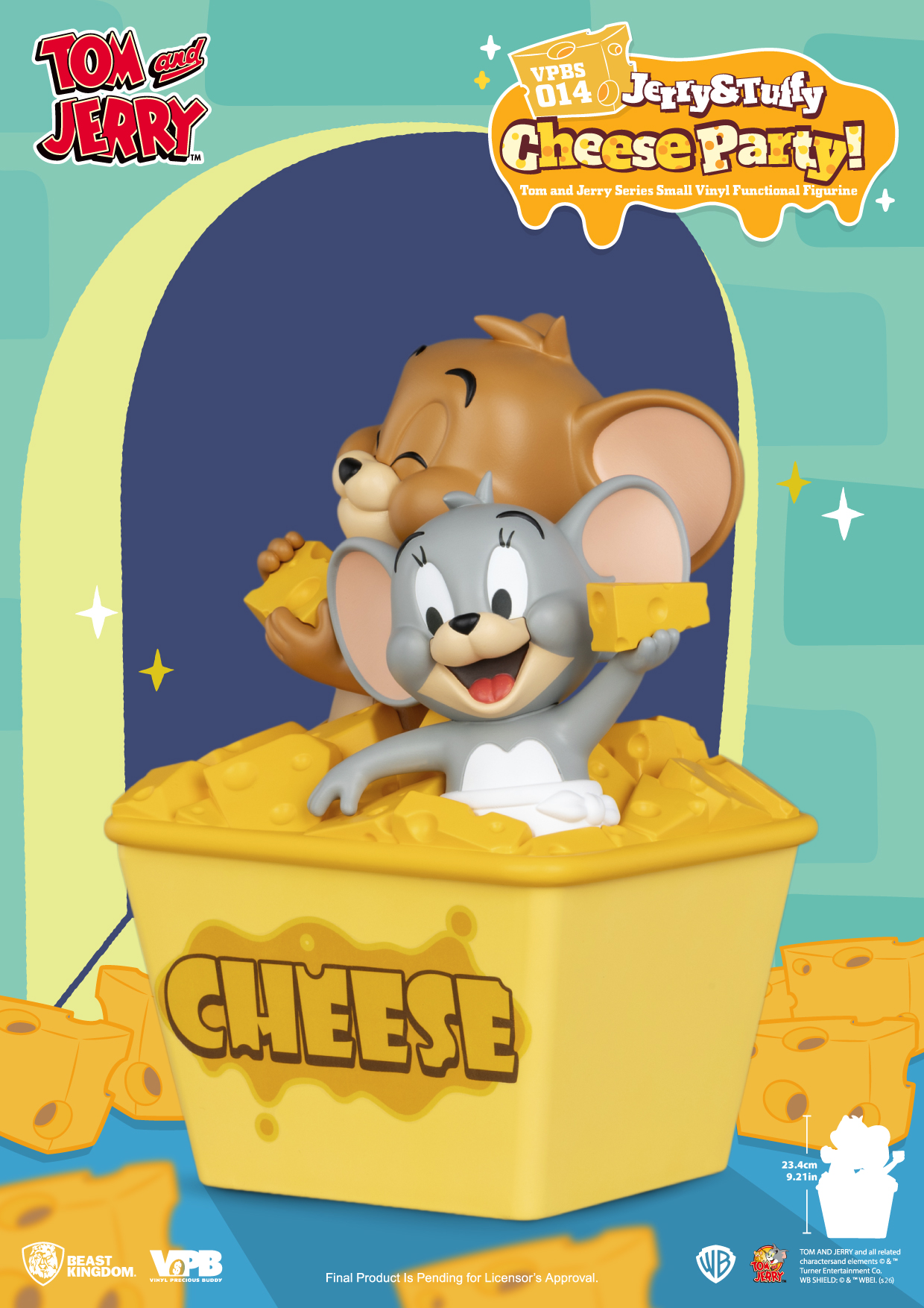 兩隻小傢伙整個泡在滿滿的起司桶裡:傑利鼠抱著被咬了一口的起司,臉上滿是得意與滿足;泰菲則開心舉起手中起司,正在分享屬於起司愛好者的勝利果實。亮黃桶身完整呈現濃郁的起司質感,搭配逗趣又生動的動作神情,讓整體造型可愛到讓人完全無法抵抗。